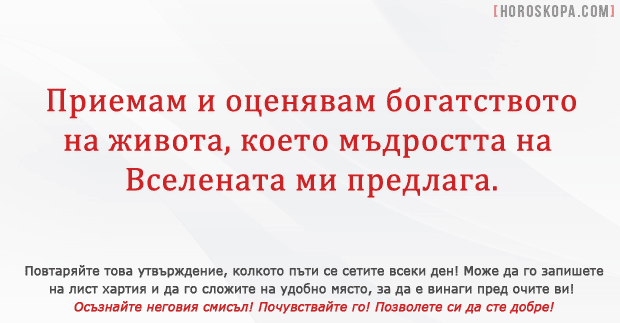 Приемам и оценявам богатството на живота, което мъдростта на Вселената ми предлага.